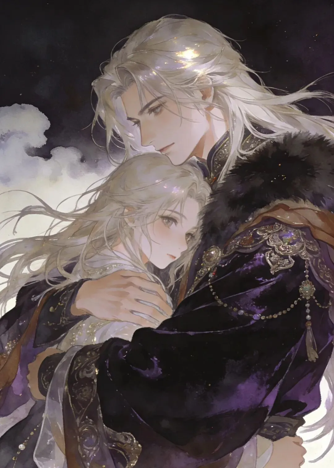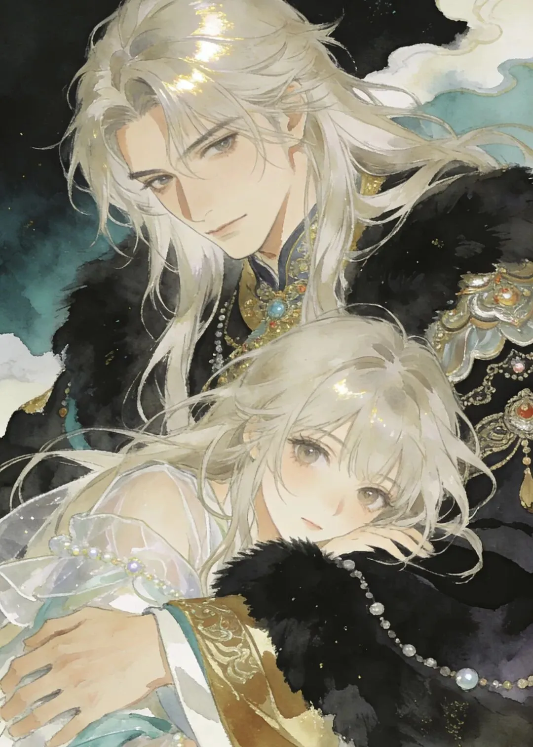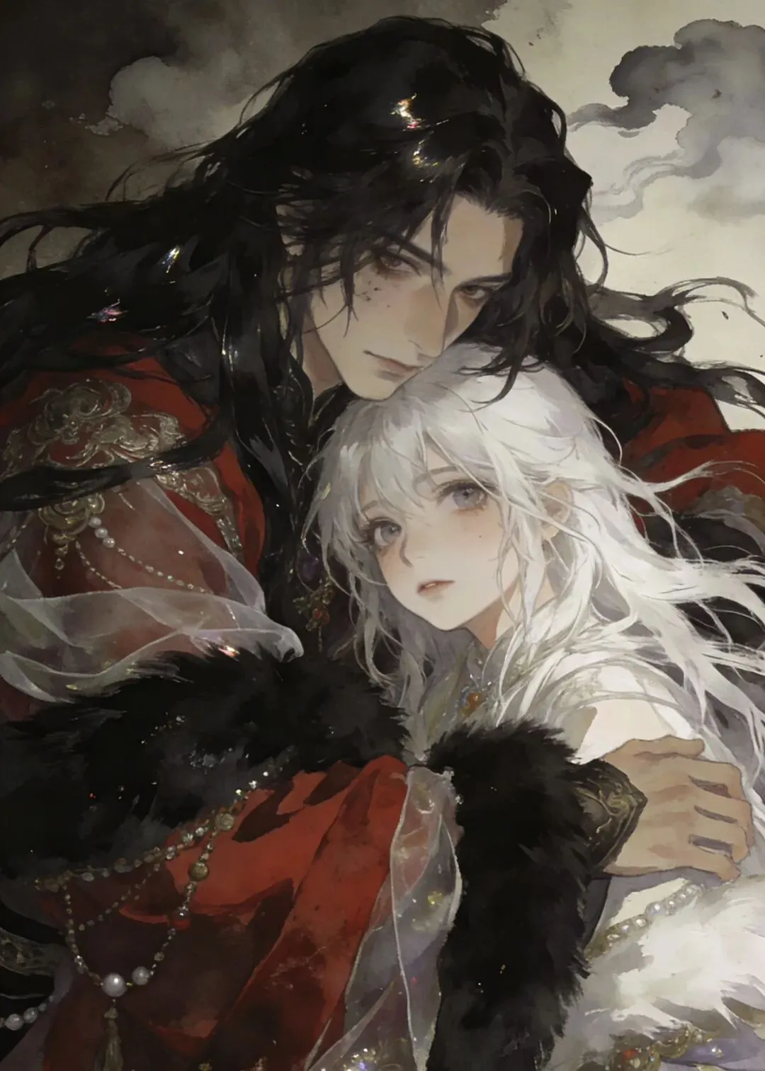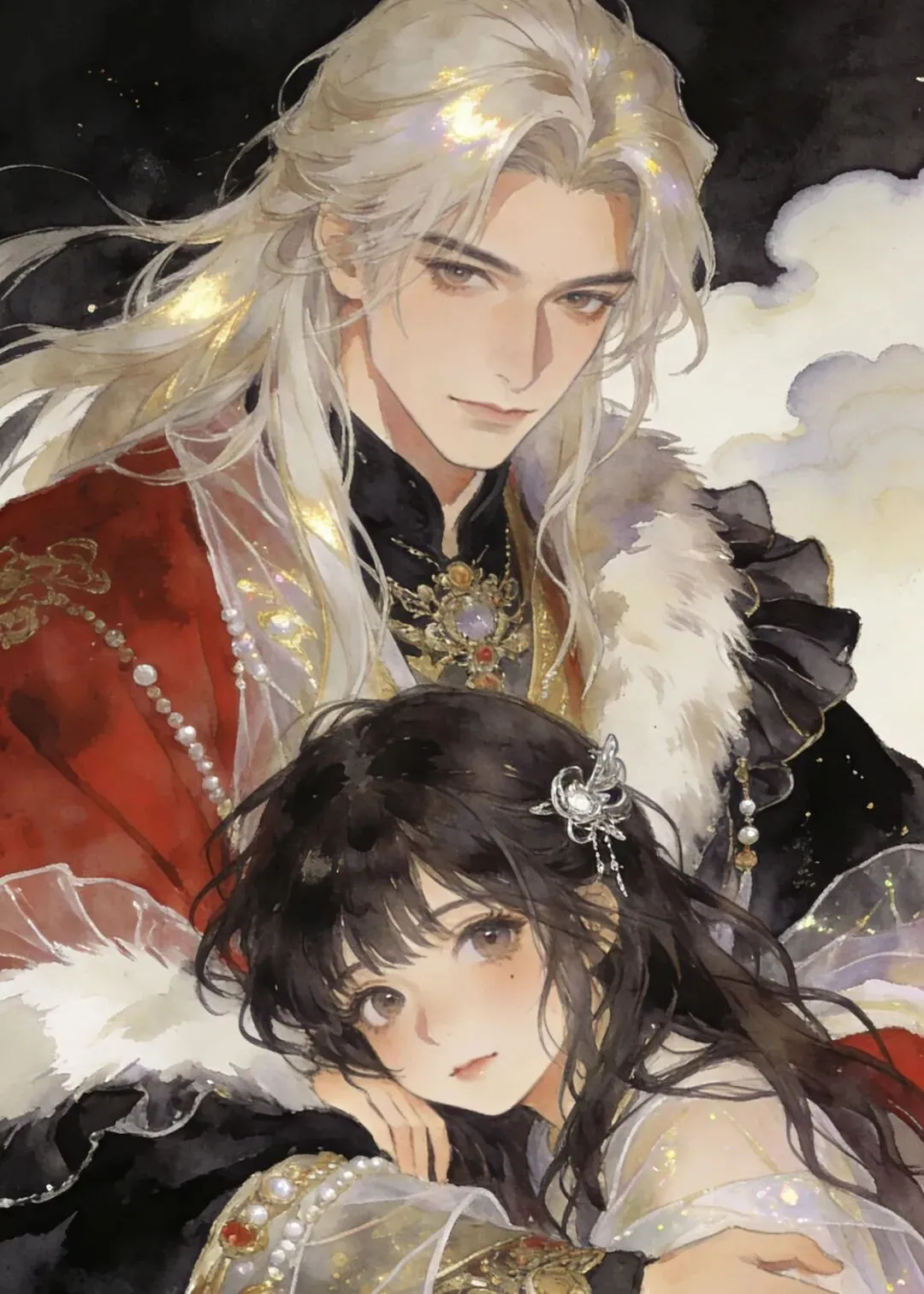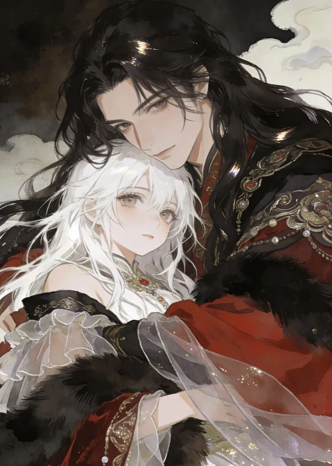 赤墨凝金覆浅云,长丝曜彩拥芳人。