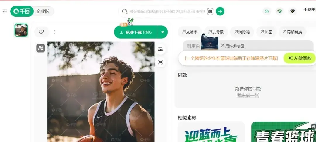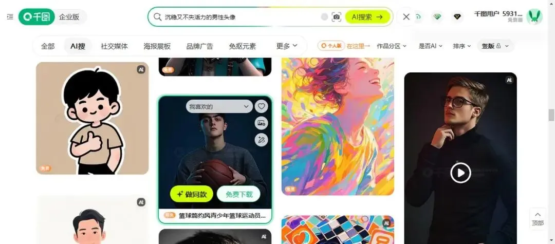 • 优点:千图网最大的优势是提供了海量的PSD、AI等源文件格式。这意味着你可以直接在Photoshop或Illustrator里打开,把头像的衣服换个颜色、调整一下背景,甚至把五官进行微调。它的“找相似”功能也很好用,找到一张合适的,就能顺藤摸瓜找到一整套风格类似的素材。同时,它还整合了AI创作能力,能根据你的描述生成特定风格的头像,创意空间很大。