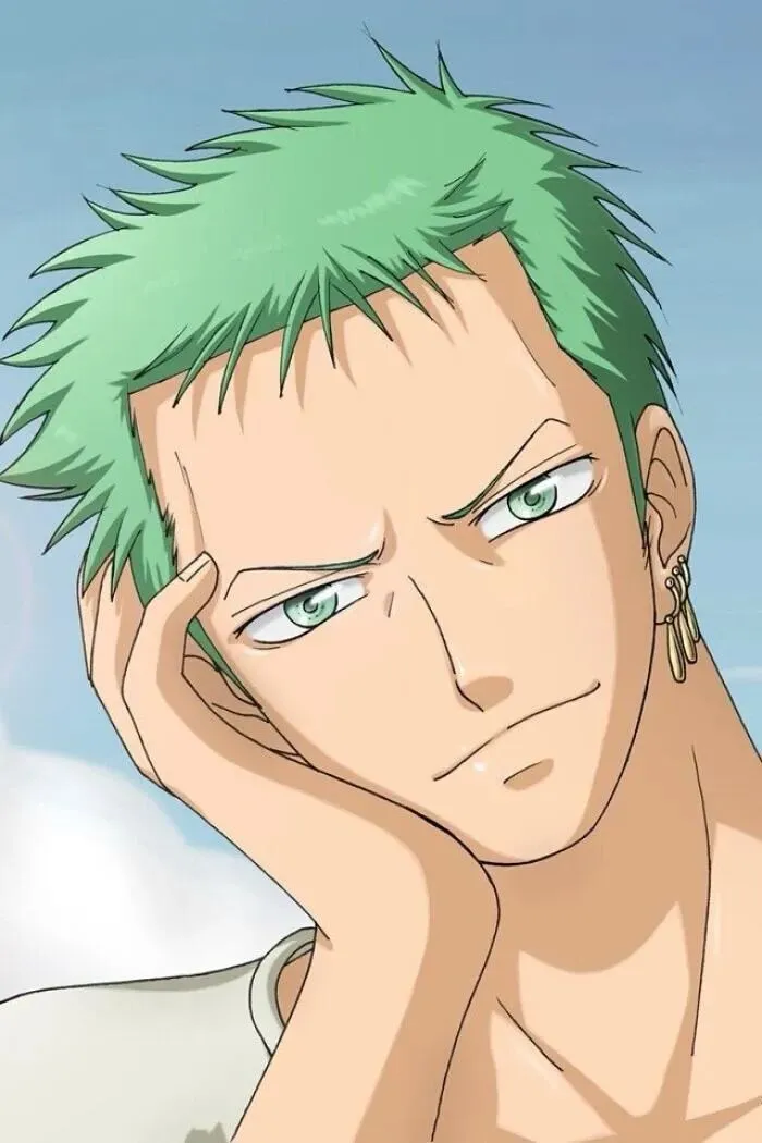 4. 罗罗诺亚·索隆(海贼王):绿发头巾,三刀流站姿,冷灰背景,眼神锐利,气场足不杂乱;