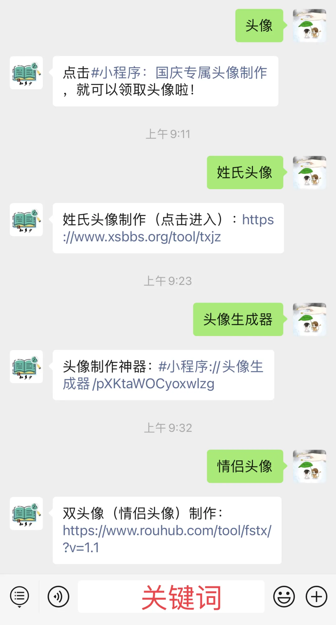 第一步:点击下方公众号名片,关注我们,点击发送消息,进入公众号后台;第二步:点击发消息进入公众号后台以后,发送关键词:情侣头像 ,等待1秒钟,点击蓝色字体链接进入;第三步:即可进行上传自己喜欢的情侣头像图片,选择大小样式进行制作,可以调整图片大小,没有情侣的朋友也不用伤心哟,可以选择自己的偶像进行制作;第四步:上传喜欢的头像完成以后,点击一键生成,生成相应的图片以后,点击长按生成的头像,保存图片,就完成情侣头像(双头像)的制作啦。赶紧是做一个与自己对象的情侣头像吧,男生女生头像都可以制作免费一键生成,高端好看上档次!更多头像请回复关键词:国庆头像 姓氏头像 头像生成器 情侣头像 2023年新年头像回复:头像生成器