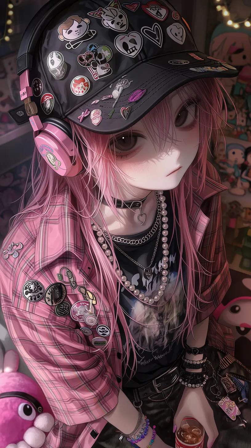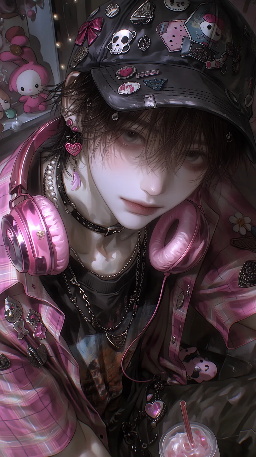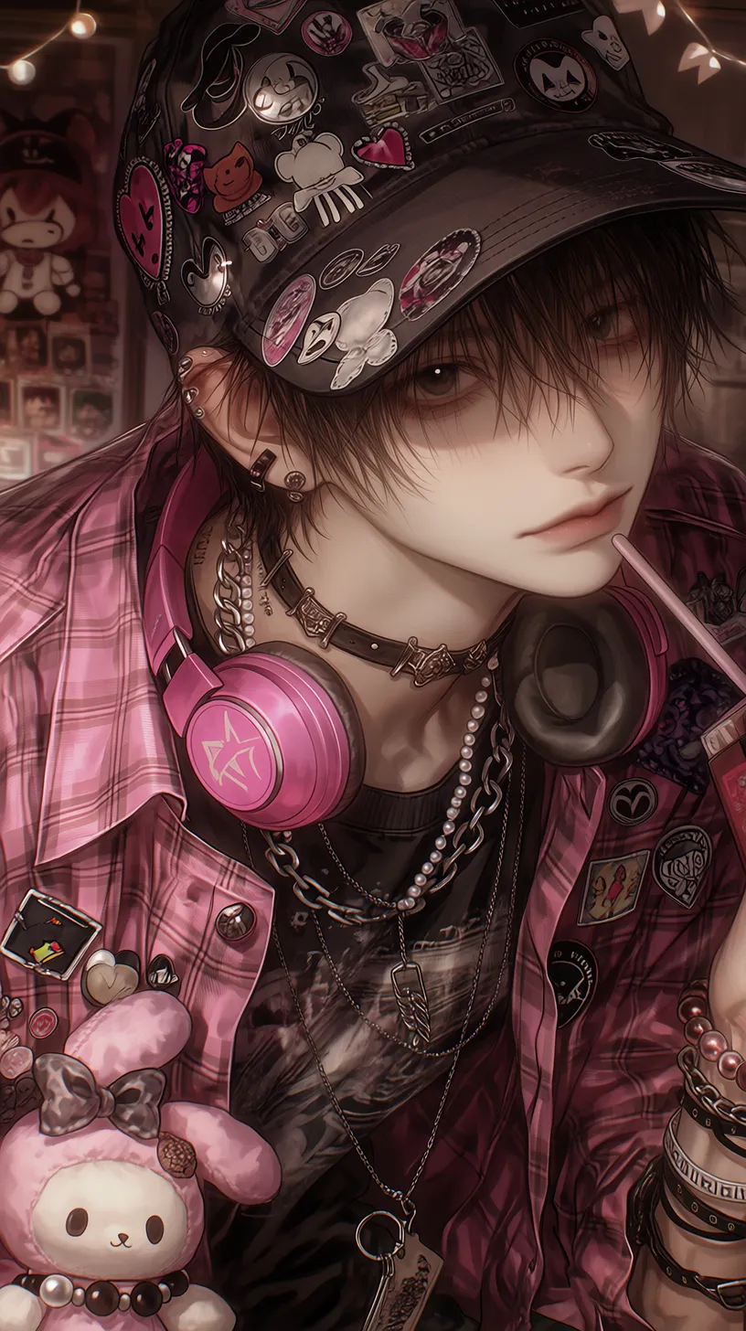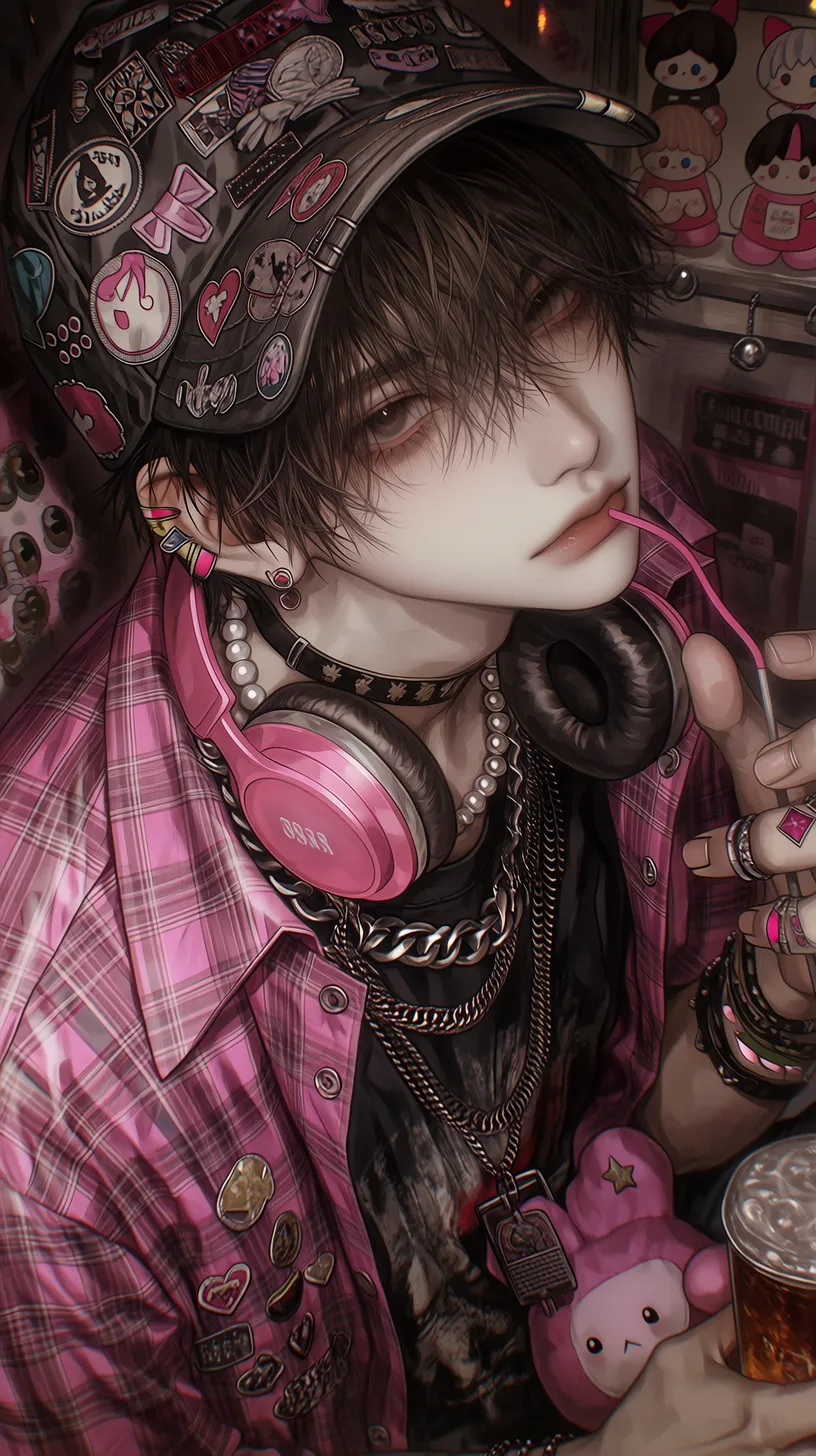 semi-realistic,细腻皮肤,地雷系繁复男性,深棕色短发,从棒球帽后洞穿出,深褐色眼眸,表情慵懒中带着可爱,眼神柔和向侧上方看镜头,俯拍上半身特写,侧上方视角,戴一顶黑色棒球帽,帽子上别满各种徽章和布贴(骷髅爱心、蝴蝶结、星星),穿着黑色印花T恤,外搭粉色格子衬衫敞开,衬衫上别着不同风格的胸针,叠戴多层项链(银色古巴链、珍珠项链、黑色皮质颈链)脖子上挂粉色耳机,手腕上不同材质的手链,腰间挂着粉色毛绒玩偶和钥匙串,一手拿着波子汽水,背景是昏暗的原宿风格房间,有模糊的玩偶墙和彩灯 --ar 9:16 --stylize 333 --niji 7【注】: semi-realistic 即 半写实