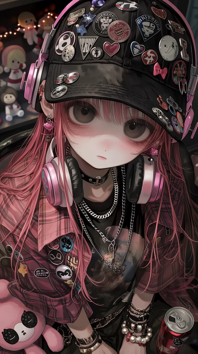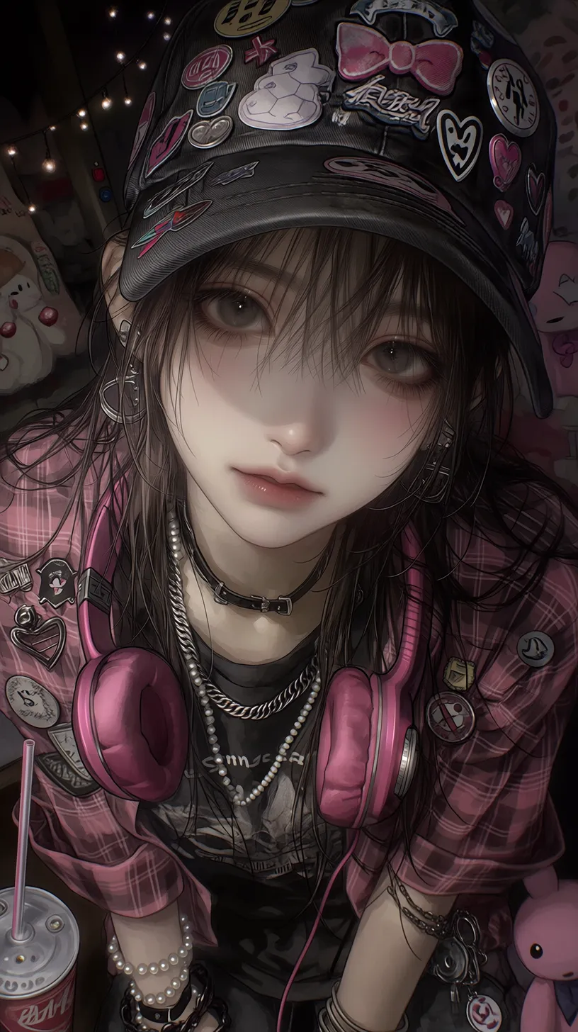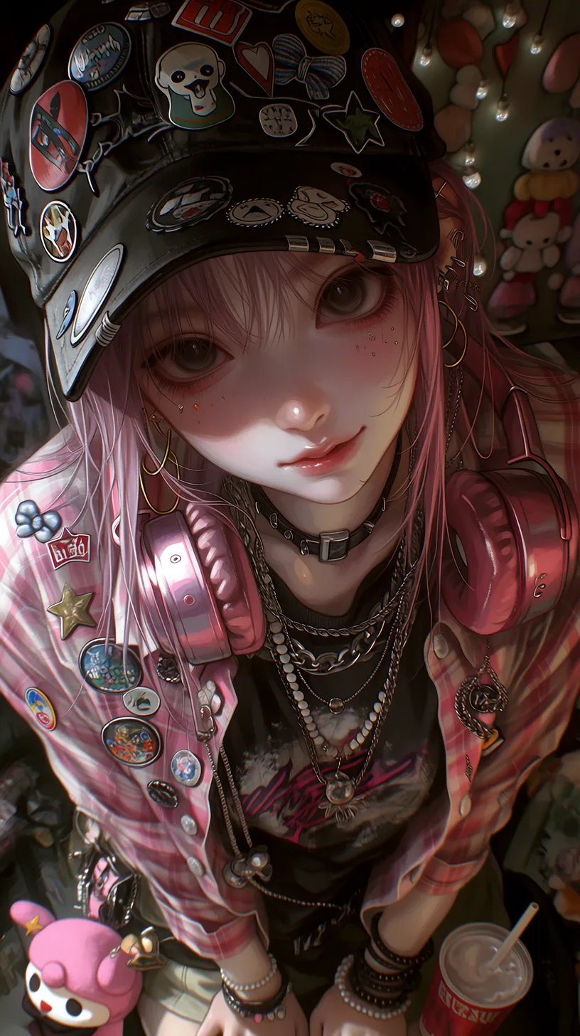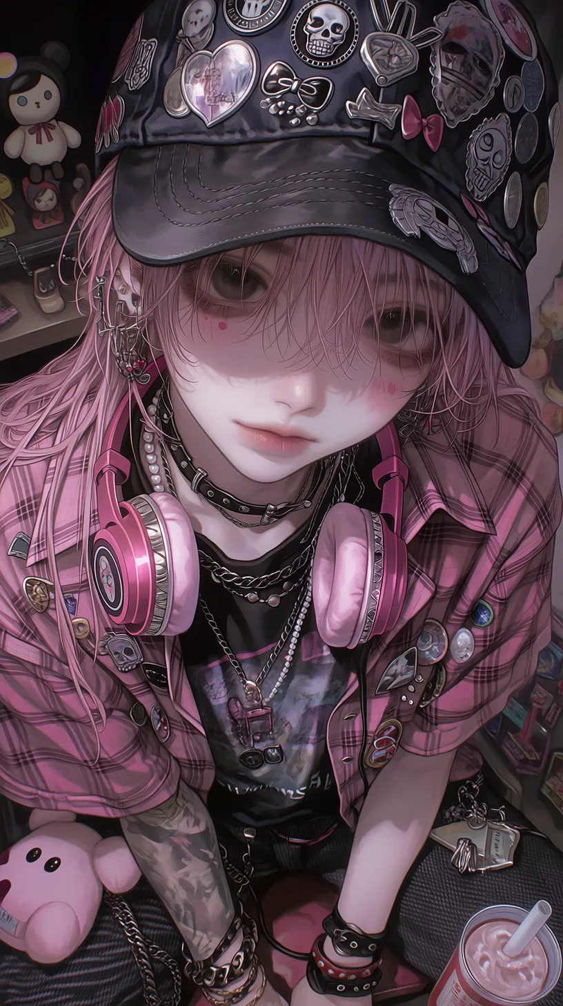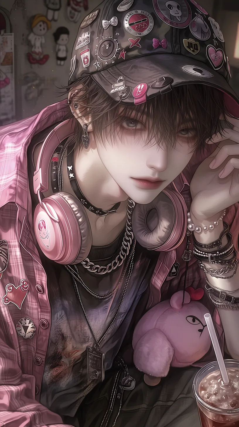 semi-realistic,细腻皮肤,地雷系繁复男性,深棕色短发,从棒球帽后洞穿出,深褐色眼眸,表情慵懒中带着可爱,眼神柔和向侧上方看镜头,俯拍上半身特写,侧上方视角,戴一顶黑色棒球帽,帽子上别满各种徽章和布贴(骷髅爱心、蝴蝶结、星星),穿着黑色印花T恤,外搭粉色格子衬衫敞开,衬衫上别着不同风格的胸针,叠戴多层项链(银色古巴链、珍珠项链、黑色皮质颈链)脖子上挂粉色耳机,手腕上不同材质的手链,腰间挂着粉色毛绒玩偶和钥匙串,一手拿着波子汽水,背景是昏暗的原宿风格房间,有模糊的玩偶墙和彩灯 --ar 9:16 --stylize 333 --niji 7【注】: semi-realistic 即 半写实