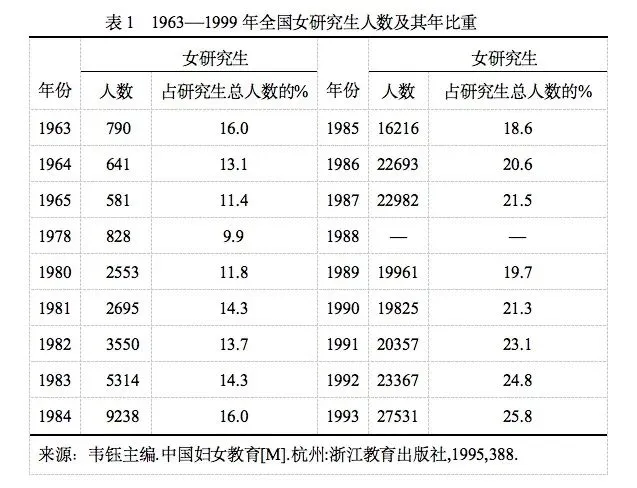 在各类教育中女性教育机会显著提高。在小学中,1951年女生占在校生的比例为28%,1965年达到39%,1980年达到44%,1993年上升到46.8%。在普通中学中,1951年女生占在校生的25.6%,到1965年增加到32.2%,1980年占39.6%,1993年达到43.7%。新中国成立以来,女大学生人数也在不断增长。1949年,女大学生人数为2.32万人,1993年女大学生人数增长到85.2万人,占在校学生总人数的33.6%。改革开放后,研究生教育快速扩展。1972—1992年,我国招收了320472名硕士生和28245名博士生,其中106482名为女性硕士生[2]。女性研究生所占比例呈逐渐上升趋势(详见表1)。